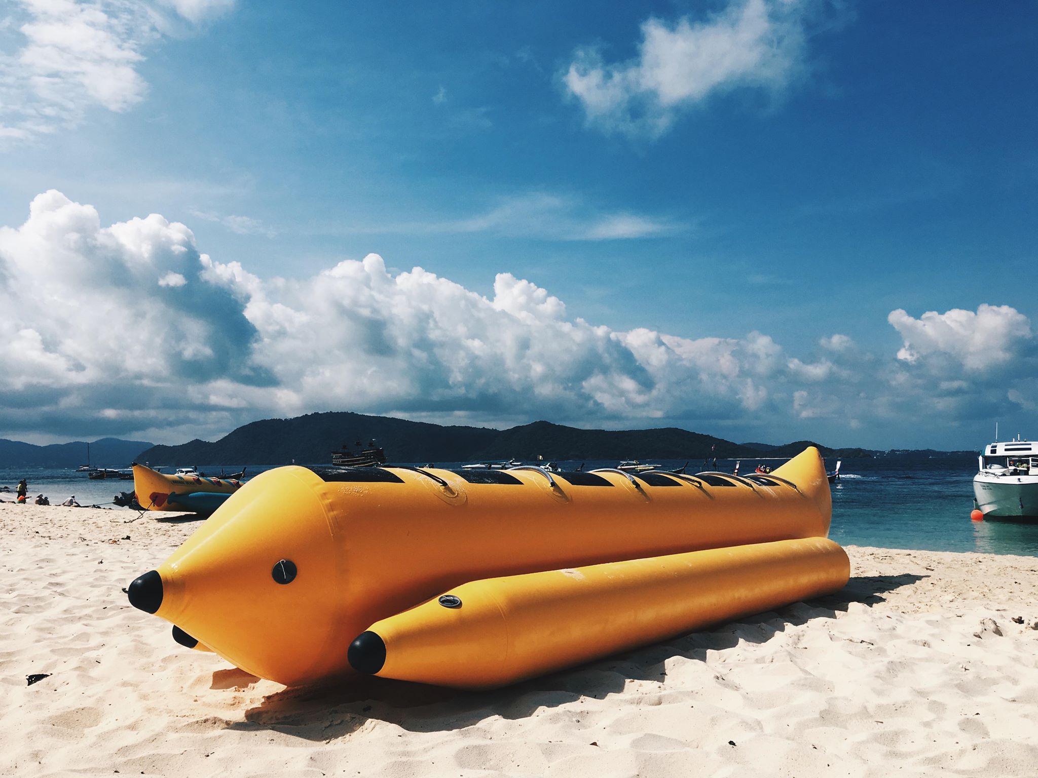 ภาพของเกาะเฮที่เราจะไปนั้น ค่อยๆใหญ่ขึ้นตามระยะทางที่เราเข้าใกล้ หาดที่เราจะไปคือ “หาดกล้วย”หรือ “BANANA BEACH” เรือของพวกเราค่อยๆเข้าฝั่งอย่างช้าๆ เราค่อยๆแบกสัมภาระและเสบียงไปหาที่นั่งริมหาด ซึ่งการจะมีที่นั่งในหาดนี้ได้นั้นก็ต้องเสียเงินเช่นเคย แต่จะให้ทำไงได้ เราก็ต้องมีที่วางของนี่นะ…