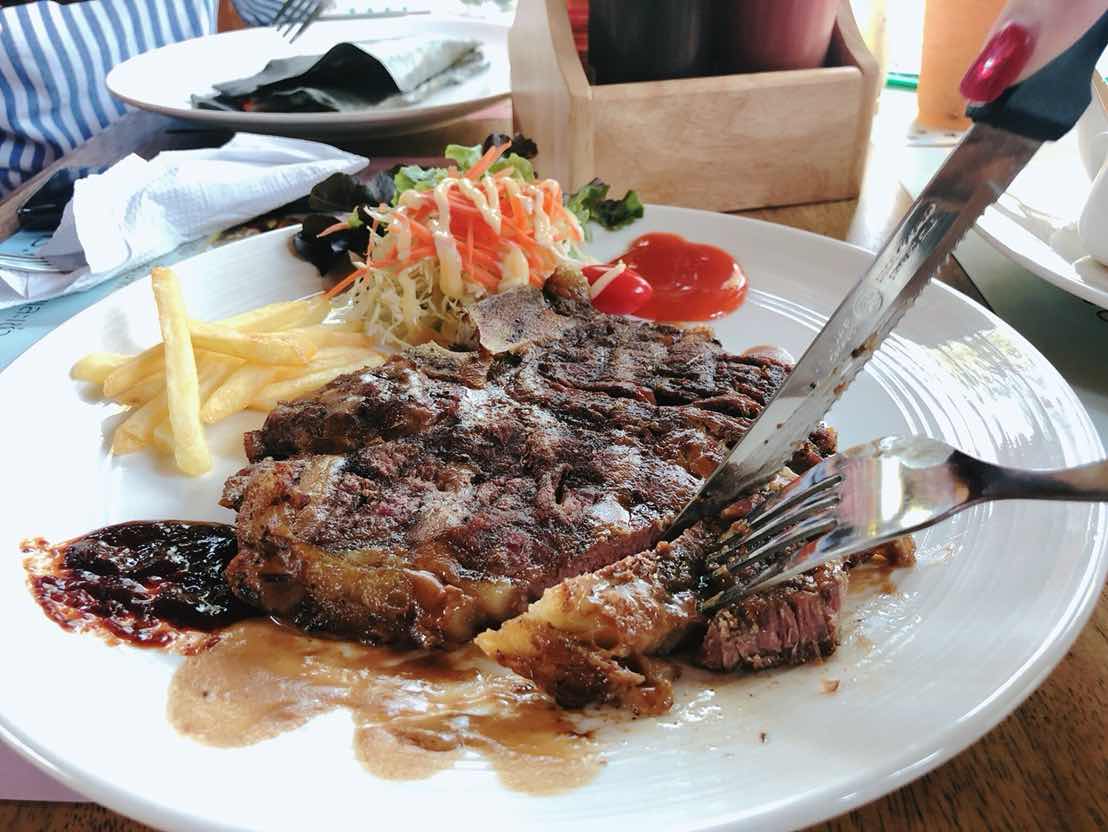 ขอเริ่มที่เมนูหลักๆอย่าง (สเต็กทีโบน) สเต็กเนื้อชื้นโตที่เหนียวนุ่มกำลังพอดี ใครสายกินเนื้อ ขอบอกเลยว่าต้องมาลอง เพราะเนื้อที่นี่ คุณเจ้าของร้านบอกเองเลยว่า เป็นเนื้อนำเข้าจากประเทศออสเตรเลียเลย ราดด้วยน้ำซอสเกรวีสูตรของทางร้านเอง กินแล้วเข้ากั๊นเข้ากัน แต่ขอบอกนิดนึง บนโต๊ะจะมีกล่องเครื่องปรุงอยู่ แนะนำลองทานกับน้ำจิ้มแจ่วดูนะคะ โอ้โห บอกเลยว่าอร่อยมากๆ แจ่วของที่นี่เผ็ดซี๊ดโดนใจ ถูกปากคนไทยอย่างแน่นอน อ้อลืมบอกไป สเต็กของที่นี่ก็จะเสิร์ฟพร้อมกับเฟรนฟรายด์และสลัดผัก เป็นมื้อหลักที่อิ่มกำลังพอดีเลยค่ะ