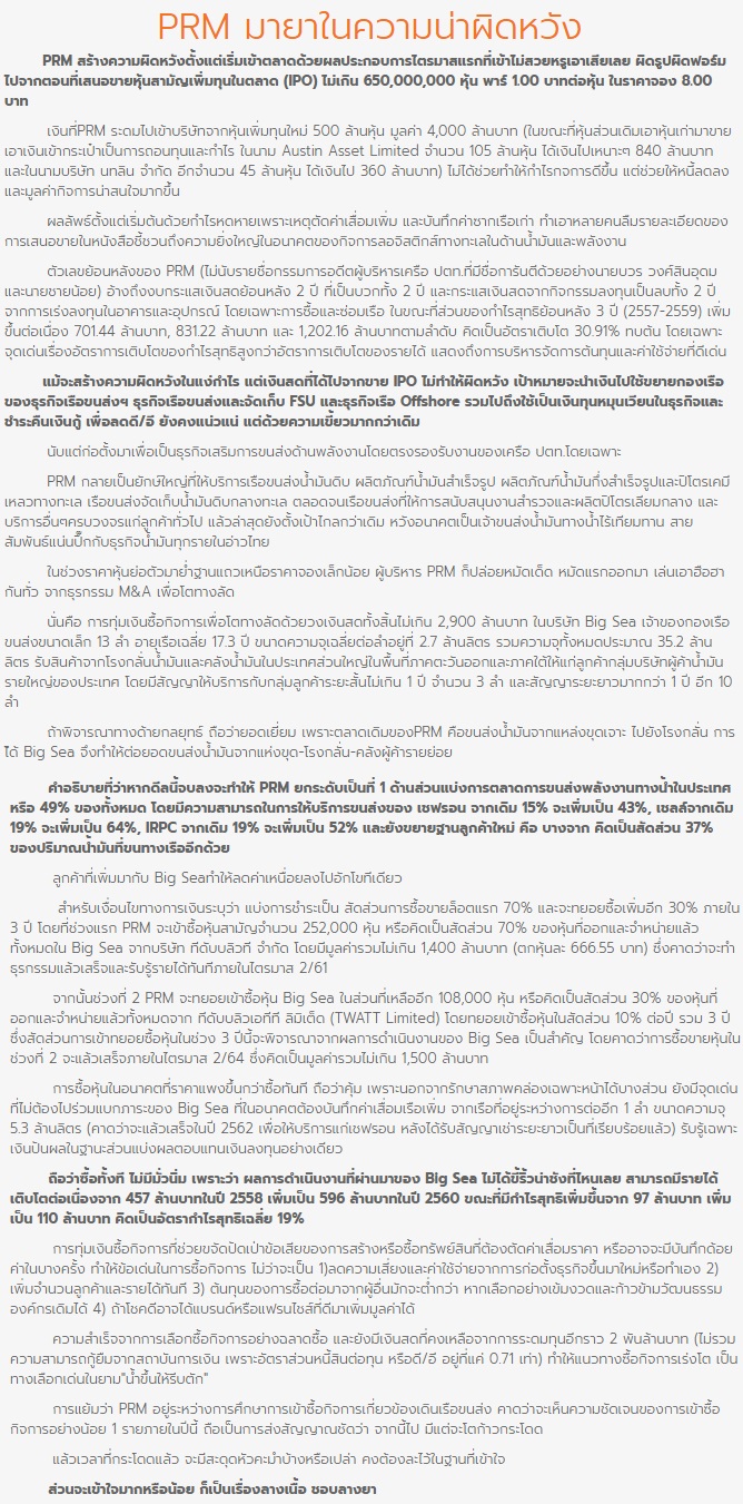......คำอธิบายที่ว่าหากดีลนี้จบลงจะทำให้ "PRM" ยกระดับเป็นที่ 1 ด้านส่วนแบ่งการตลาดการขนส่งพลังงานทางน้ำในประเทศ หรือ 49% ของทั้งหมด โดยมีความสามารถในการให้บริการขนส่งของ เชฟรอน จากเดิม 15% จะเพิ่มเป็น 43%, เชลล์จากเดิม 19% จะเพิ่มเป็น 64%, IRPC จากเดิม 19% จะเพิ่มเป็น 52% และยังขยายฐานลูกค้าใหม่ คือ บางจาก คิดเป็นสัดส่วน 37% ของปริมาณน้ำมันที่ขนทางเรืออีกด้วย....