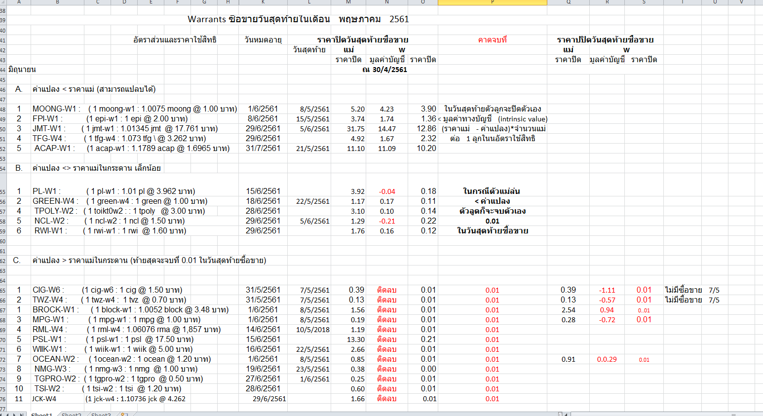 Warrants ที่เหลือซื้อขายวันสุดท้ายในเดือน พฤษภาคม 2561 จำแหนก 3 หมวดดังนี้