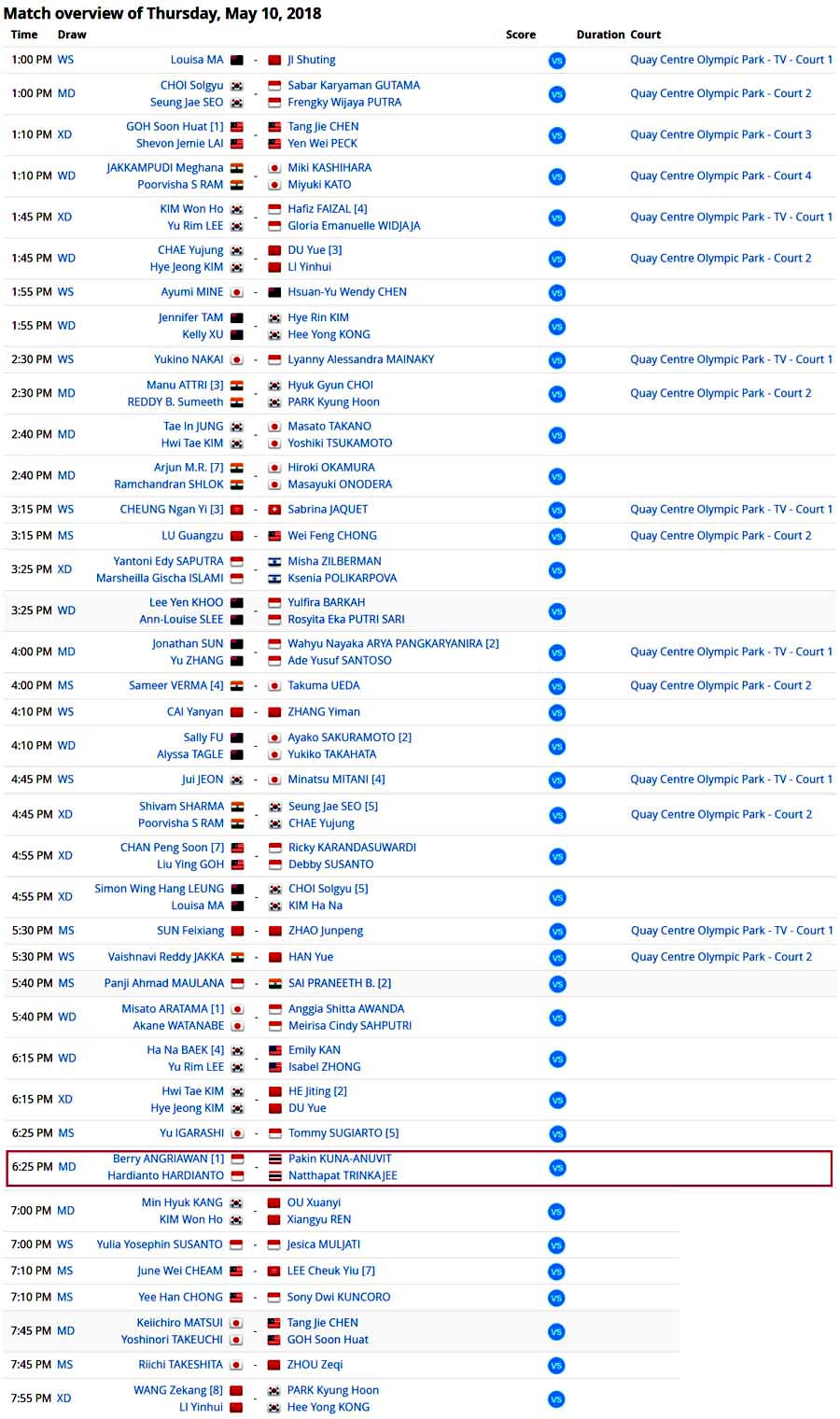 • โปรแกรม/ผลการแข่งขันทั้งหมด รอบ 16 คน (10 พ.ค. 61) [เวลาทาง AUSTRALIA เร็วกว่าไทย 3 ชม.]