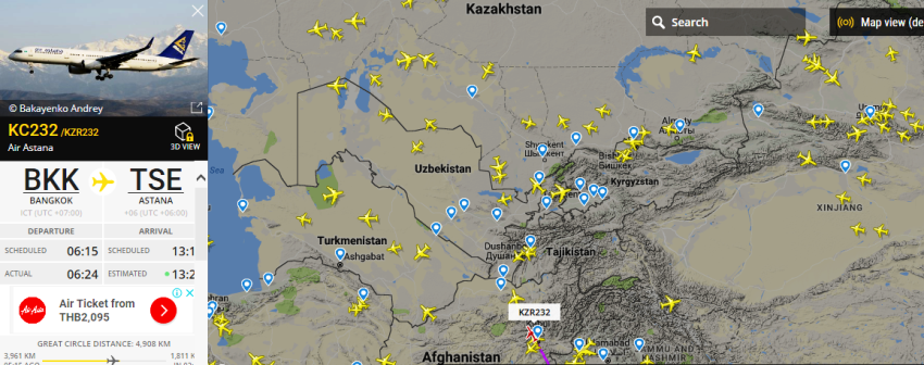 11.40 น.Air Astana KC232 กำลังบินออกจากอัฟกานิสสถาน ตรงไป Astana Int'l airport ประเทศคาซักสถาน จะแลนดิ้งตามกำหนดเวลา 14.15(ไทย) เพื่อเปลี่ยนไฟท์บินต่อไปเมืองเยคาเดรินเบอร์ก ประเทศรัสเซีย เวลา 15.45(ไทย) โดย flight 271 แลนดิ้งเวลา17.35 (ไทย)ครับ
