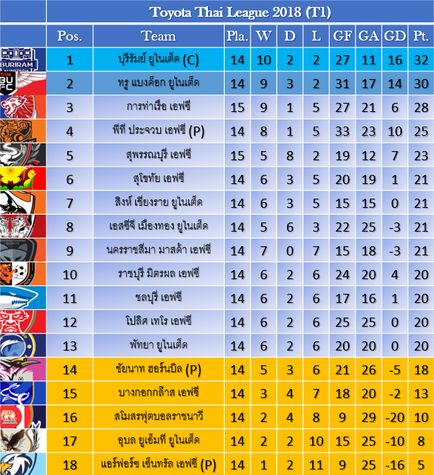สรุปผลฟุตบอล ไทยลีก 2018 ประจำวันเสาร์ที่ 22 กันยายน 2561 พร้อมตารางคะแนน