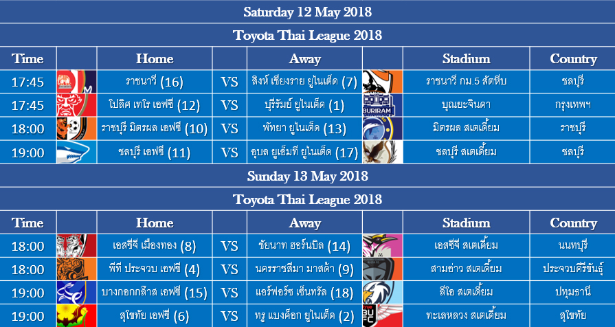 สรุปผลฟุตบอล ไทยลีก 2018 ประจำวันเสาร์ที่ 12 พฤษภาคม 2561 พร้อมตารางคะแนน