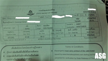 (หมายถึงรถไฟออกจากสถานีนะ ไม่ใช่เวลาออกจากบ้านของเรานะ)เพราะฉะนั้นเราต้องไปถึงก่อนเวลารถไฟออก) ส่วนเวลาถึง(เวลาที่ถึงสถานีอยุธยา) เวลาออกของขบวนรถไฟที่เราไป คือ 07.49 น.-08.37 ประเภทของรถไฟที่เรานั่งคือ รถไฟเร็ว ขบวนที่ 111 หรือถ้าใครอยากได้แบบธรรมดา ไม่อยากจองตั๋วผ่านระบบ ก็ลองโทรไปจองกับ 1690 เบอร์รถไฟ แต่ต้องจองล่วงหน้าอย่างน้อย 5 วันนะ หรือถ้าบ้านใครอยู่ใกล้สถานี ก็ไปซื้อที่สถานีได้ เพราะถ้าไปซื้อที่สถานี ไม่ต้องเสียค่าธรรมเนียม ถ้าจองจะเสียค่าธรรมเนียม 20 บาท แต่ถ้าใครบ้านไกลจากสถานี เราแนะนำให้จองตั๋วทางเว็บแล้วปริ้นหรือแคปตั๋วในหน้าจอโทรศัพท์ไปให้เจ้าหน้าที่ที่เค้าตรวจตั๋วดูจะดีกว่า เพราะไหนจะค่ารถเดินทางไปซื้อตั๋วค่าไปค่ากลับ ตรงนี้เราต้องคำนวณให้ดีว่าคุ้มมั้ย ถ้าค่ารถใครไม่ถึง 20 บาททั้งค่าไปและค่ากลับ จะไปซื้อที่สถานีก็ได้ อีกอย่างเราไม่แนะนำให้ไปซื้อตั๋วตอนเช้าของวันที่จะไปนะ เพราะอาจจะได้ตั๋วยืน หรือถ้าใครชิวๆ ก็ไปซื้อตอนเช้าก็ได้ เพราะทุกอย่างอาจจะไม่อย่างที่เราคิดเสมอไป (ถ้าเป็นวันหยุดนักขัตฤกษ์และวันเสาร์อาทิตย์) เมื่อได้เวลาออกแล้วเราก็เลือกตู้ของเวลาที่เราจะไป อันที่กดเลือกตู้จะเป็นสีเขียว ส่วนอันที่เลือกไม่ได้จะเป็นออกสีเทาๆ นิดนึง จากนั้นเราก็เลือกว่าจะไปชั้นไหน ชั้น 2หรือชั้น 3 แต่ชั้น 2 เต็มเร็วมาก เราเลือกชั้น 2 ไม่ได้ เพราะเต็มแล้ว เราเลยเลือกชั้น 3 จากนั้นก็จะให้ระบุผู้เดินทาง และก็จะมีสามปุ่มด้านล่าง ปุ่มแรก ย้อนกลับ ปุ่มสอง เลือกที่นั่งเอง และปุ่มสาม เลือกที่นั่งแบบอัตโนมัติ ซึ่งเรากดที่เลือกที่นั่ง และเมื่อเรากดเข้าไปแล้ว เหลืออยู่แค่ 4 ที่จร้า ที่เราตกใจคือ เราไปกับเพื่อน แต่ดีนะที่ไปกันแค่สองคนพอมีตัวเลือก จากนั้นเราก็เลือกที่นั่ง จากนั้นยืนยันการเลือกที่นั่ง และชำระเงิน สุดท้ายพิมพ์ตั๋วหรือแคปตั๋ว อีกอย่างการจองที่เผื่อเพื่อน โดยการจอง 2 ที่ แต่ชื่อเดียวกัน เราขอแนะนำไม่ควรทำ เพราะที่นั่งของใครก็ควรเป็นชื่อของคนนั้นนะจ๊ะ อันนี้คือตั๋วของเรา ด้านล่าง เราปริ้นออกมา