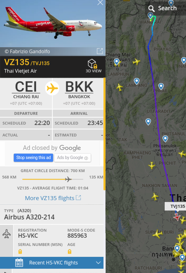 ผมเช็คดูจาก https://www.flightradar24.com เห็นมีเที่ยวบินเชียงราย กรุงเทพ ตอนประมาณสี่ทุ่ม ทุกวัน