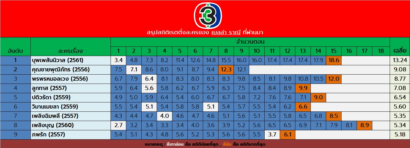 นำสถิติเรตติ้งละครของ เบลล่า ราณี มาฝากครับ