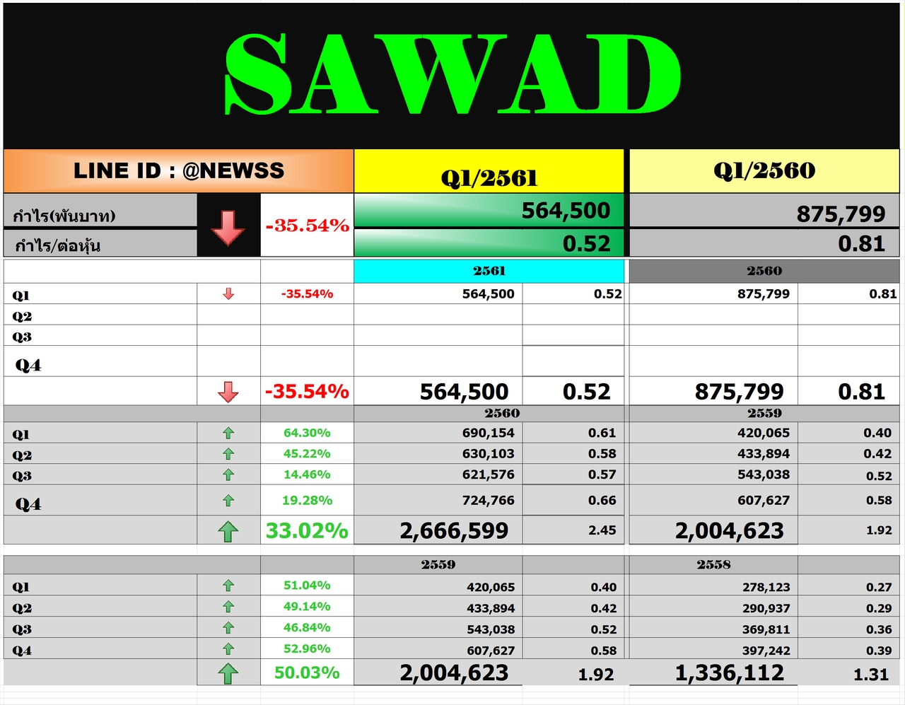 SAWAD ไหลลงไม่หยุด1 เดือน -30% ราคาต่ำสุดในรอบ 8 ปี ไตรมาส 2 เหนื่อยกำไรชะลอต่อเนื่อง . Think plus investor หุ้น SAWAD ยังโดนเทขายอย่างหนักในวันนี โดยราคาลงมาอยู่ที่ 16.90 บาท ลดลง 7.14% ด้วยมูลค่าการ