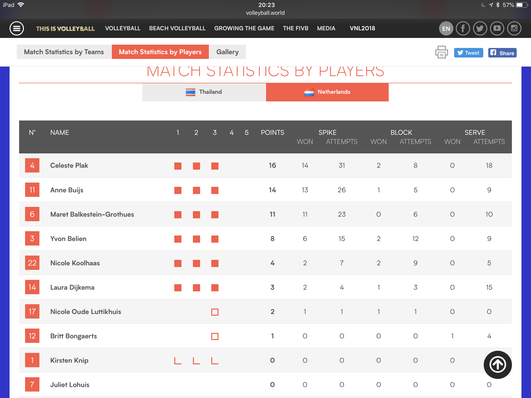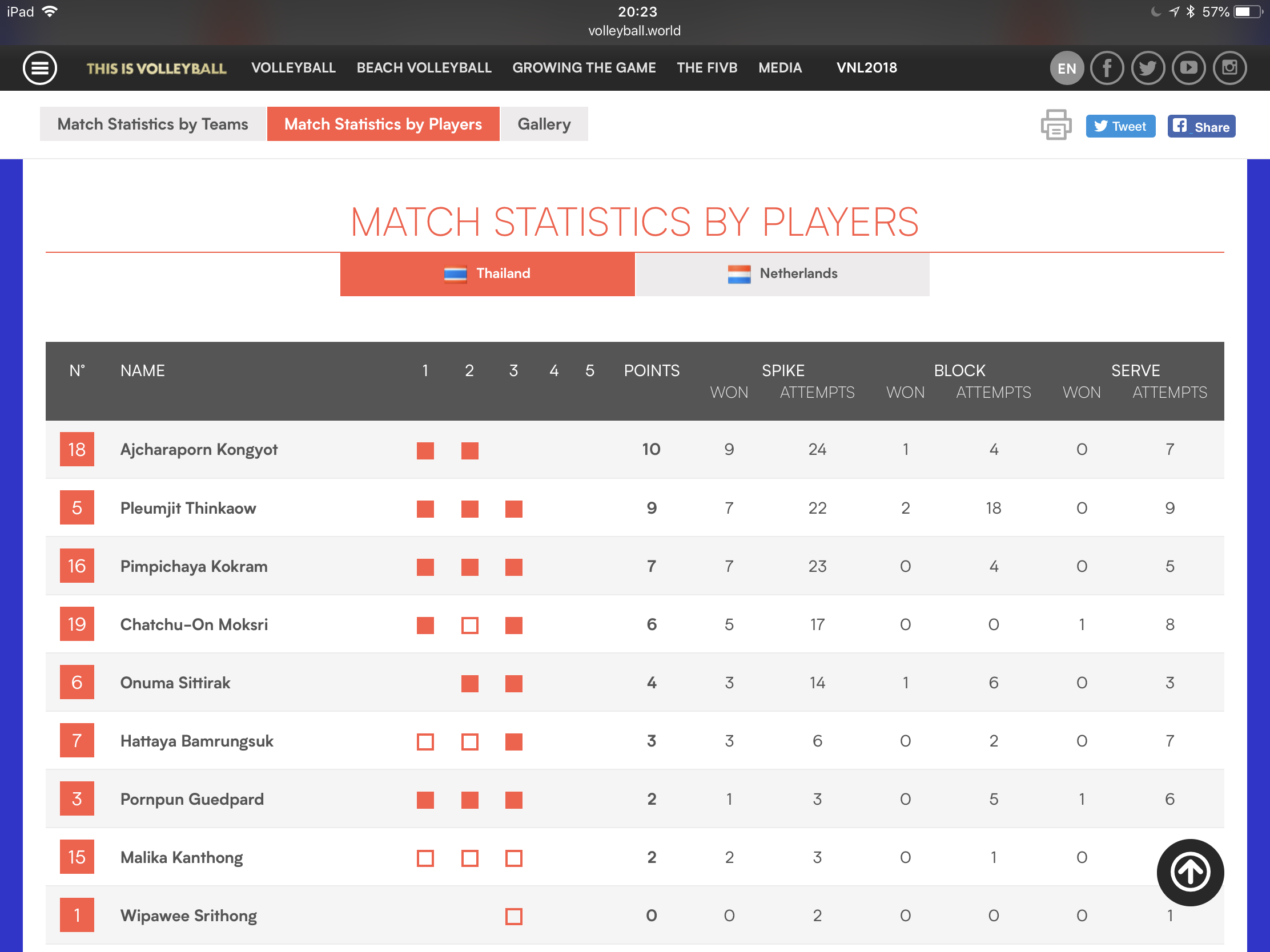 *** สถิติผู้เล่น VNL 2018 ไทย 2-3 เยอรมัน *** เพียวท๊อปสกอร์ ตบ53%