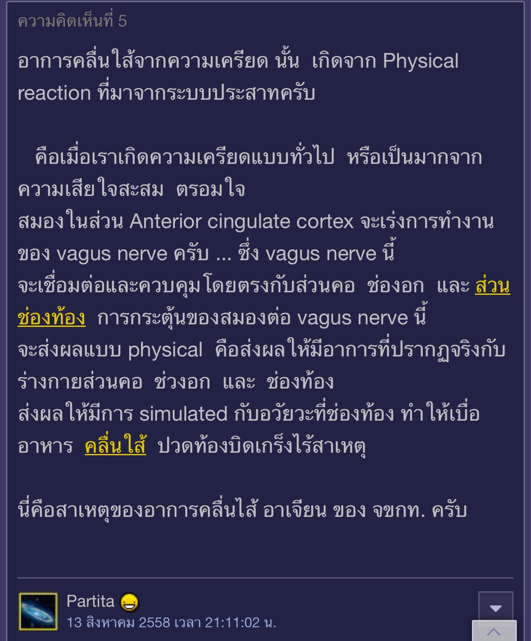 อาการร่วมคือรู้สึกคลื่นไส้บ่อยมาก โดยเฉพาะเวลาที่คิดถึงเรื่องราวที่ผ่านมา มันเป็นความรู้สึกผิดนิดๆเหมือนกับว่าผมไม่ได้พยายามมากพอที่จะเอาชนะ พอแพ้มาแล้วก็เสียใจ ไม่ให้อภัยตัวเองสักที