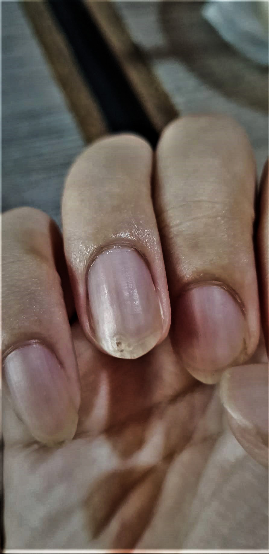 จากในภาพคือมันเลื่อนออกมาตรงส่วนเล็บตายแล้วผมเลยถ่ายรูปด้านล่างมาให้ดูด้วย ลักษณะมันเหมือนเป็นหนังตายที่แข็งๆ เป็นตุ่มออกมา พอเอาอะไรไปแคะมันก็แตกเป็นเหมือนหนังตายที่แห้งๆ ขุยๆ แต่ไม่ได้หลุดออกมาเพราะยังติดกับเล็บอยู่