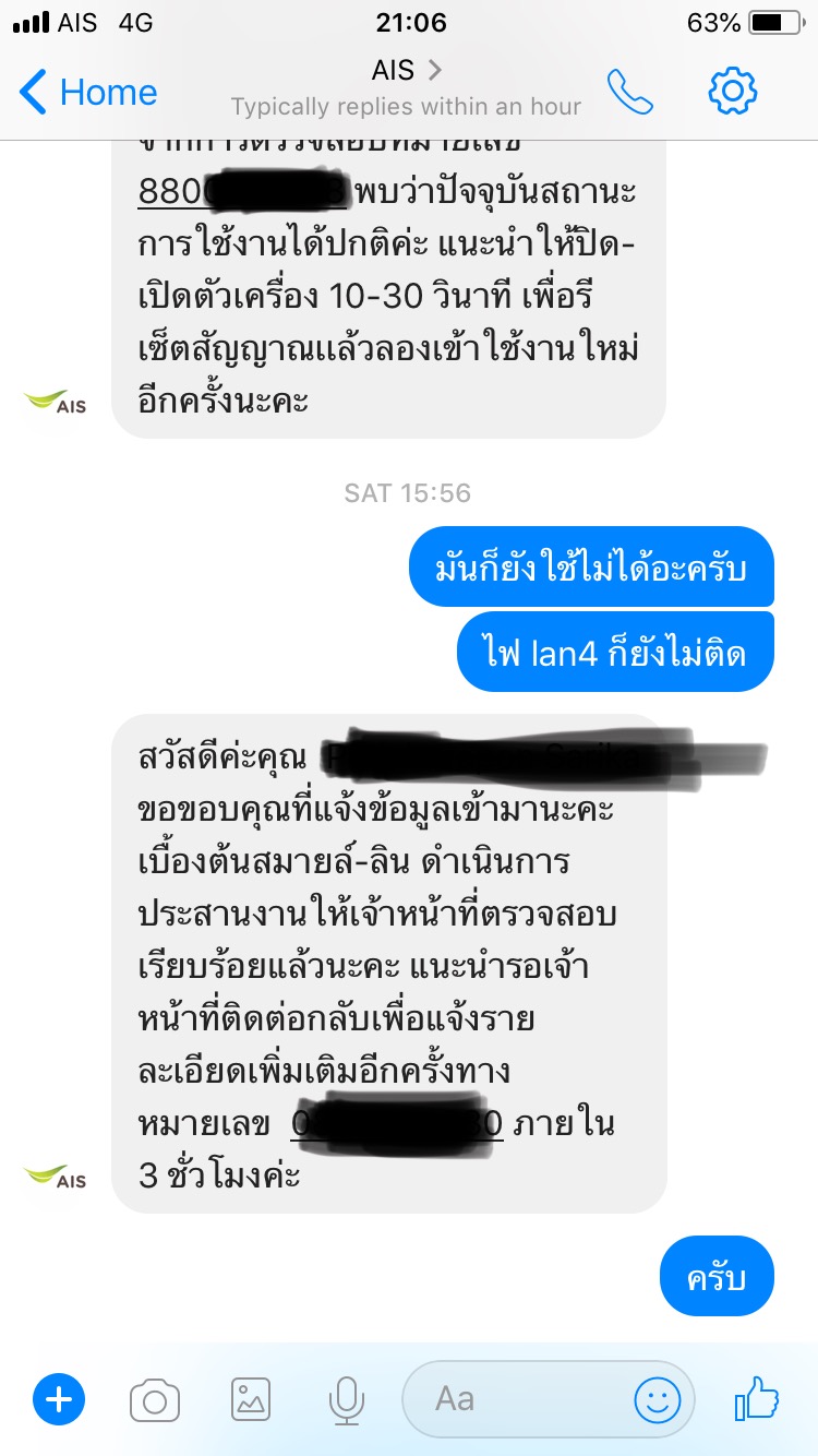 ล่าสุดผมได้รับข้อความจาก ais fibre ว่าจะมีการปรับปรุงระบบ เมื่อวันที่ 10 พ.ค. เวลา 10.00-13.00 ซึ่งผมก็ไม่ได้ตกใจอะwi แต่พอผมกลับมาใช้งานตอนเย็นก็ไม่สามารถใช้งานได้ ผมก็รอคิดว่าเดี๋ยวก็คงใช้ได้เองแหละจนผ่านไป 2 วัน ก็ยังใช้งานไม่ได้ ผมเลยทักข้อความไปหาเพจ ais ก็ได้รับคำตอบ (ผมใช้สาย lan ในการช่วยต่อ)
