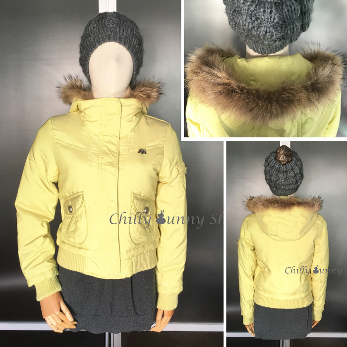 เสื้อขนเป็ดทรงแจ๊คเก็ตสีเหลืองมะนาว ฮู้ดเฟอร์แท้สีน้ำตาล
