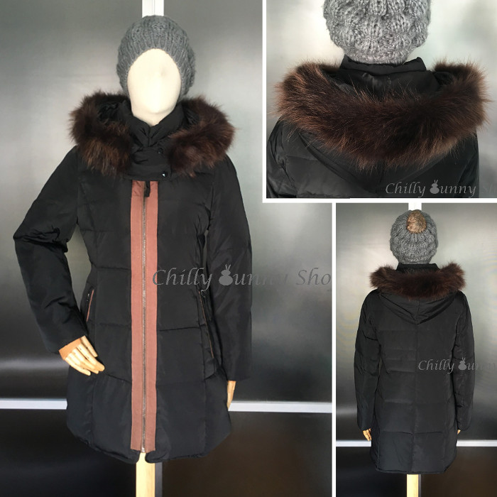 เสื้อโค้ทขนเป็ดสีดำแถบน้ำตาล ฮู้ดเฟอร์แท้เส้นใหญ่สีน้ำตาล
