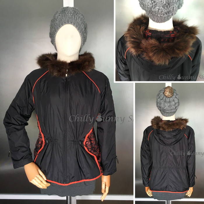 เสื้อแจ๊คเก็ตกันลมสีดำขลิบส้ม ฮู้ดเฟอร์แท้สีน้ำตาล