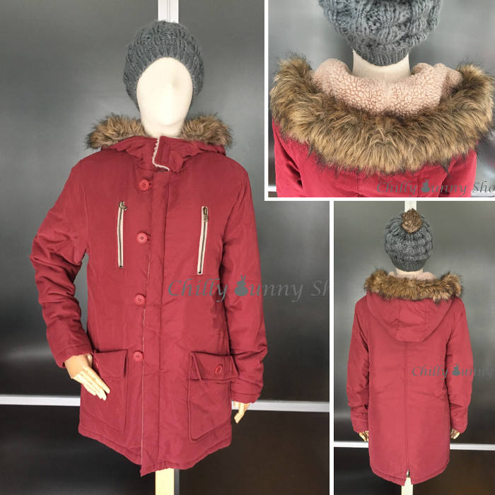 เสื้อโค้ทกันหนาวสีแดง ฮู้ดเฟอร์เทียม บุขนสีนู้ด ด้านในบุใยสังเคราะห์