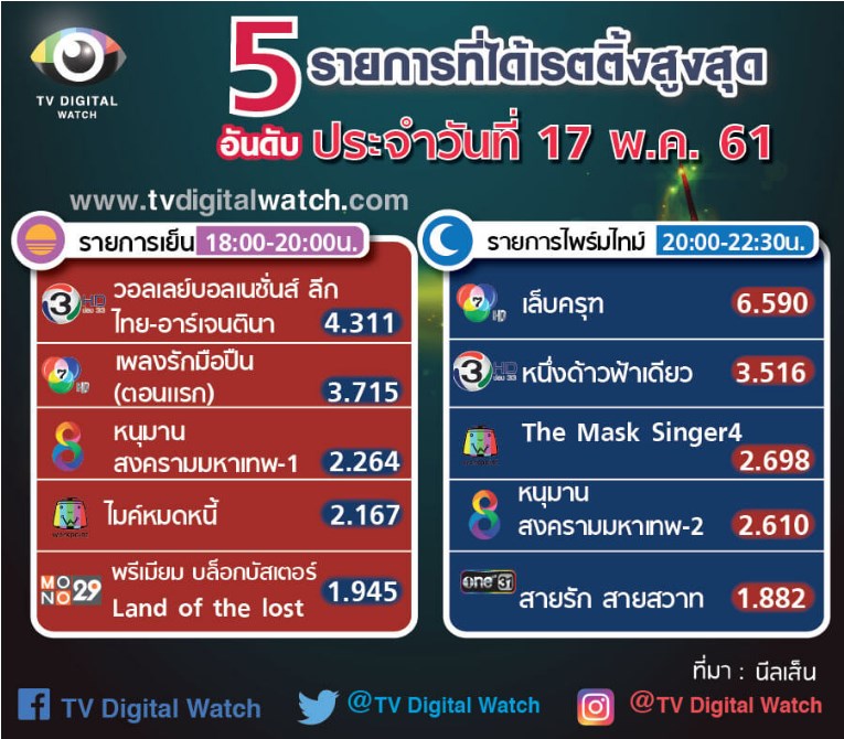 เรตติ้งละคร /รายการ/กีฬา ประจำวันที่ 17/5/61
