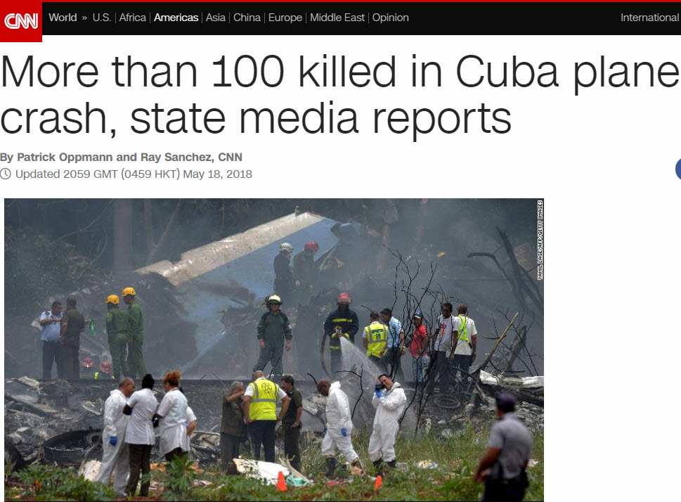 เครื่องบินโบอิ้ง737ของสายการบิน Cubana de Aviacion เที่ยวบินภายในประเทศ ดิ่งลงกระแทกพื้นบริเวณทุ่งหญ้าแห่งหนึ่งใกล้สนามบิน ขณะที่ผู้สื่อข่าวเอเอฟพีรายงานว่าพบเห็นกลุ่มควันลอยพวยพุ่งจากจุดเกิดเหตุขึ้นสู่ท้องฟ้า