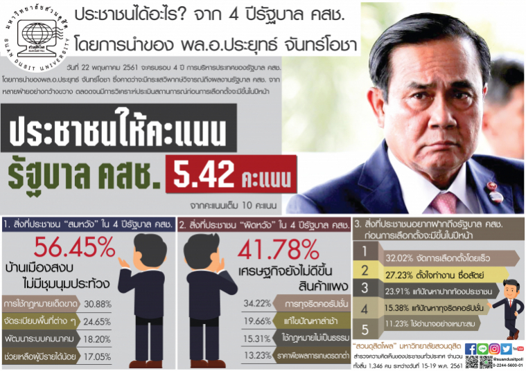 20 พ.ค.2561 - สวนดุสิตโพล มหาวิทยาลัยสวนดุสิต ได้สำรวจความคิดเห็นของประชาชนทั่วประเทศ จำนวนทั้งสิ้น 1,346 คน ในโอกาสจะครบรอบ 4 ปีการบริหารประเทศของรัฐบาลคณะรักษาความสงบแห่งชาติ (คสช.) โดยการนำของ พล.อ.ประยุทธ์ จันทร์โอชา นายกรัฐมนตรี