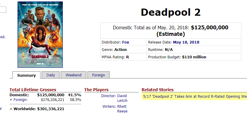 Deadpool 2 เปิดตัวรายได้ทั่วโลกสัปดาห์แรกถล่มทลาย ทำรายได้ทั่วโลกไปถึง 301 ล้าน