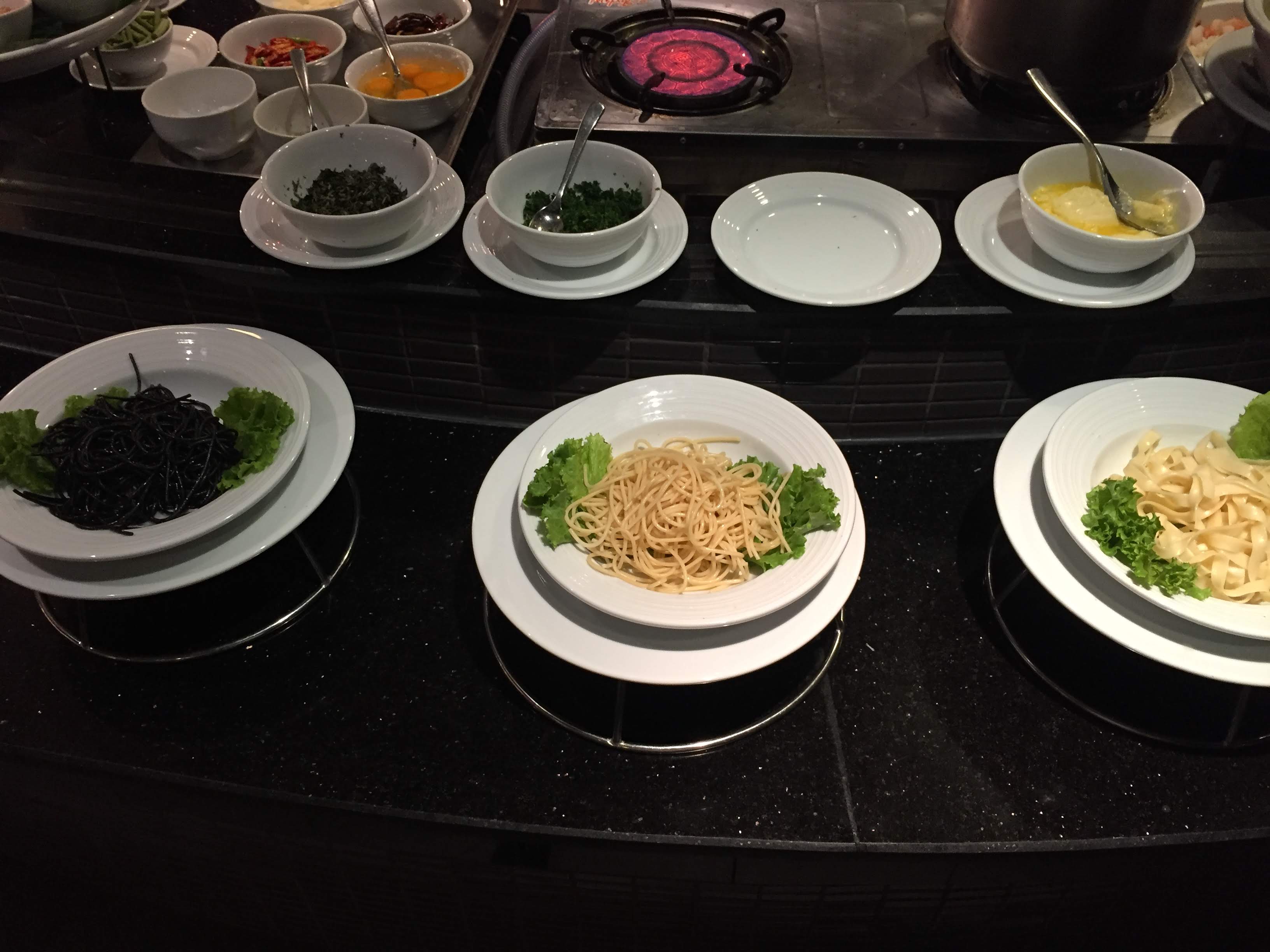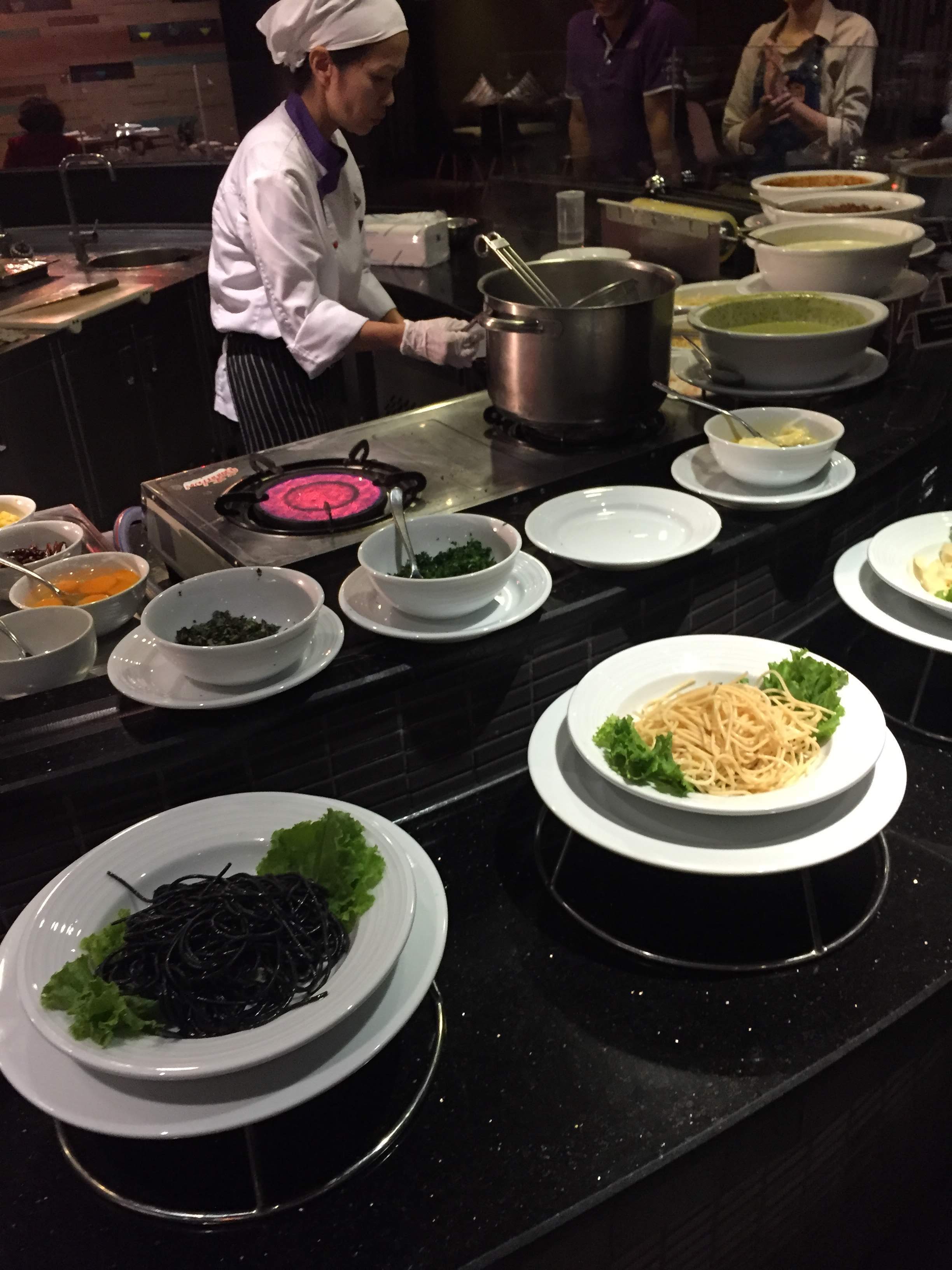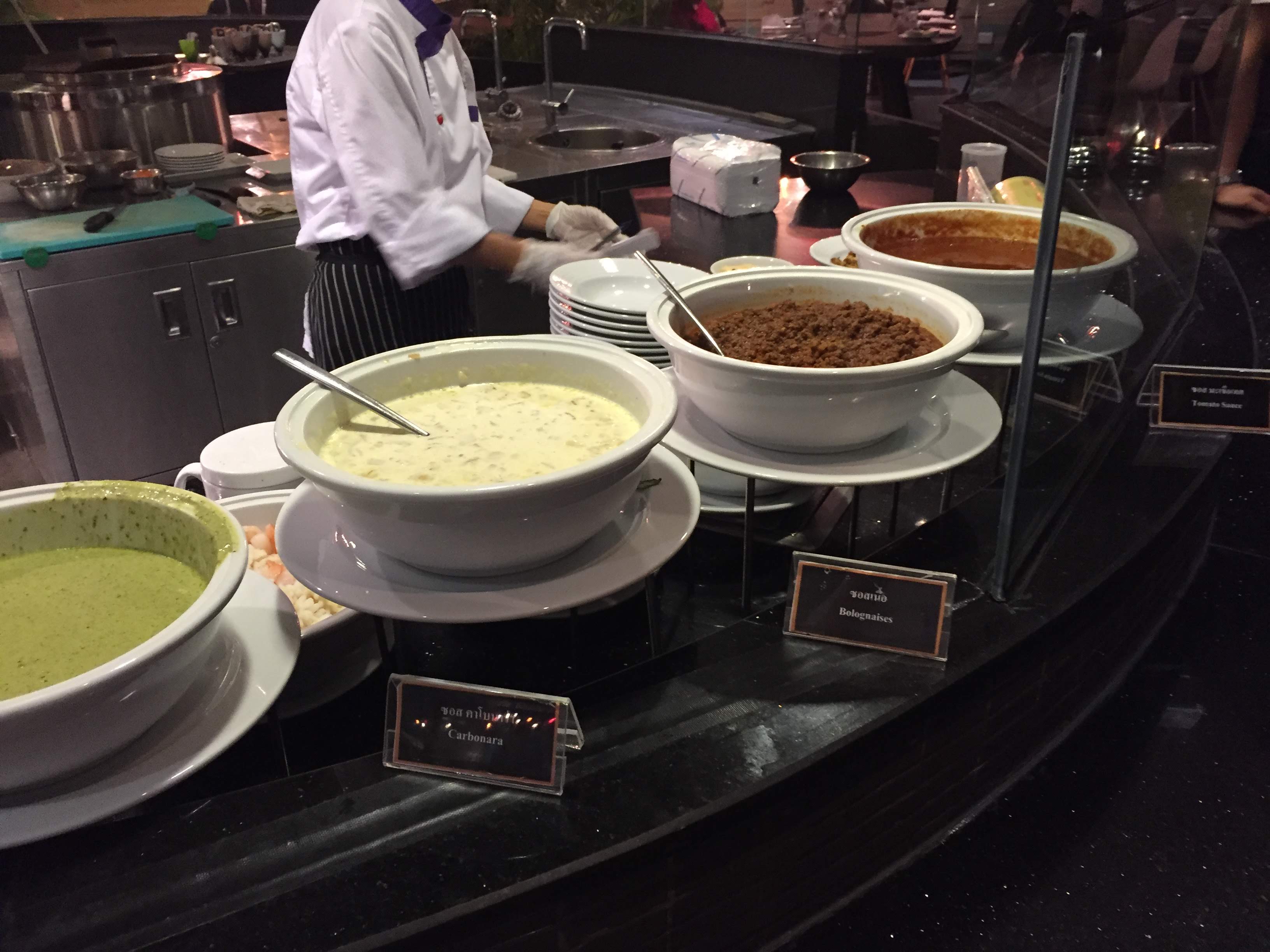 ถัดมาเป็น pasta station มีเส้นสปาเกตตี้ เส้นดำและเฟสตูชินี เลือกคู่กับซอสเพสโต, มะเขือเทศ, ซอสเนื้อ, คาโบนารา หรือผัดขี้เมา ผมเลือกทานซอสเพสโต เชฟทำมาอร่อยดีครับ