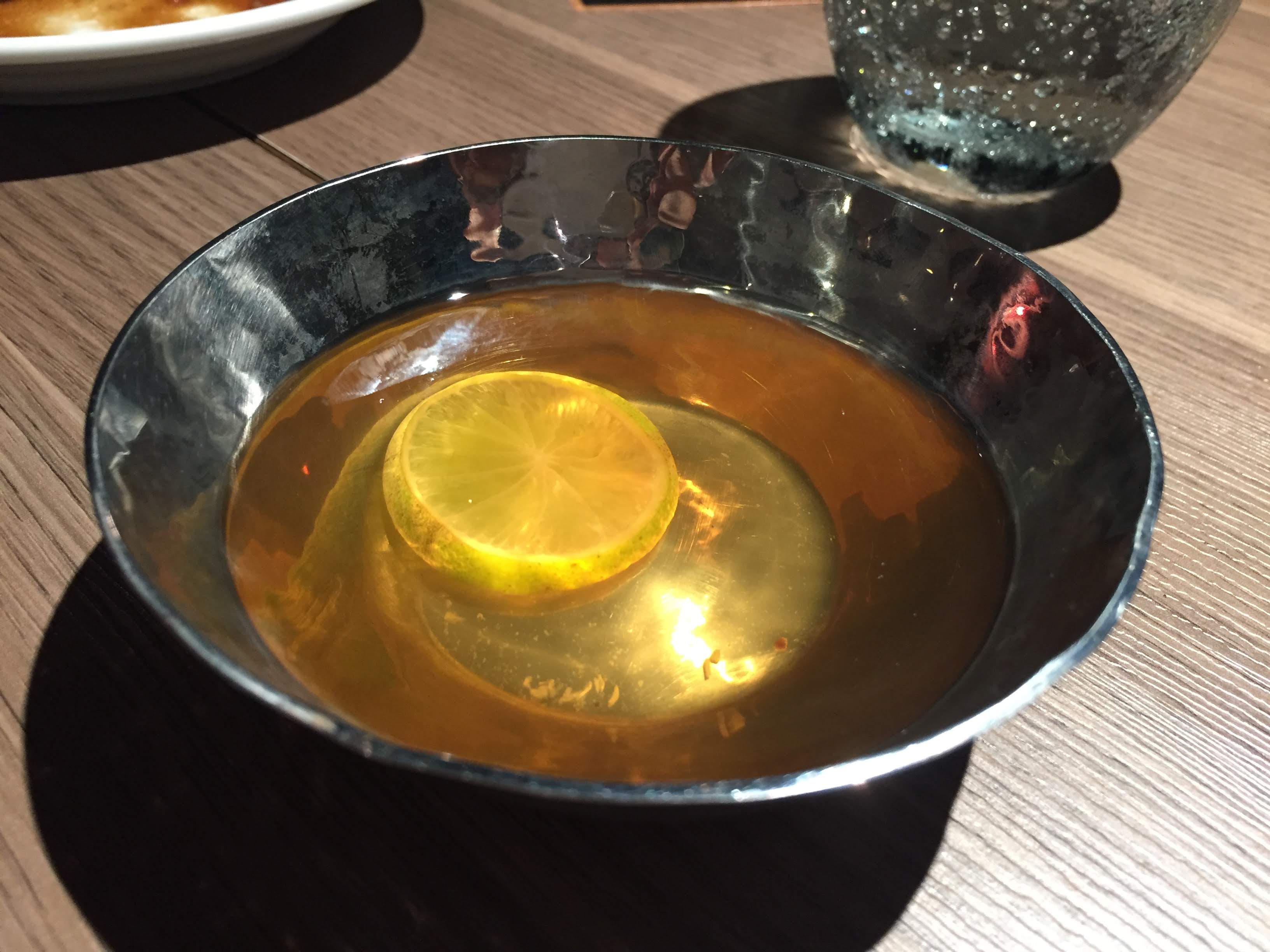 ขอชมอีกอย่างคือ เนื่องจากมีอาหารทะเลที่ต้องใช้มือแกะ เช่นกุ้ง มือเราจะเปื้อนและเหม็นคาวได้ แต่ห้องอาหารนี้มีน้ำมะนาววางให้แขกทุกคนได้ล้างมือที่โต๊ะได้เลย ชอบตรงจุดนี้มากๆเลยครับ
