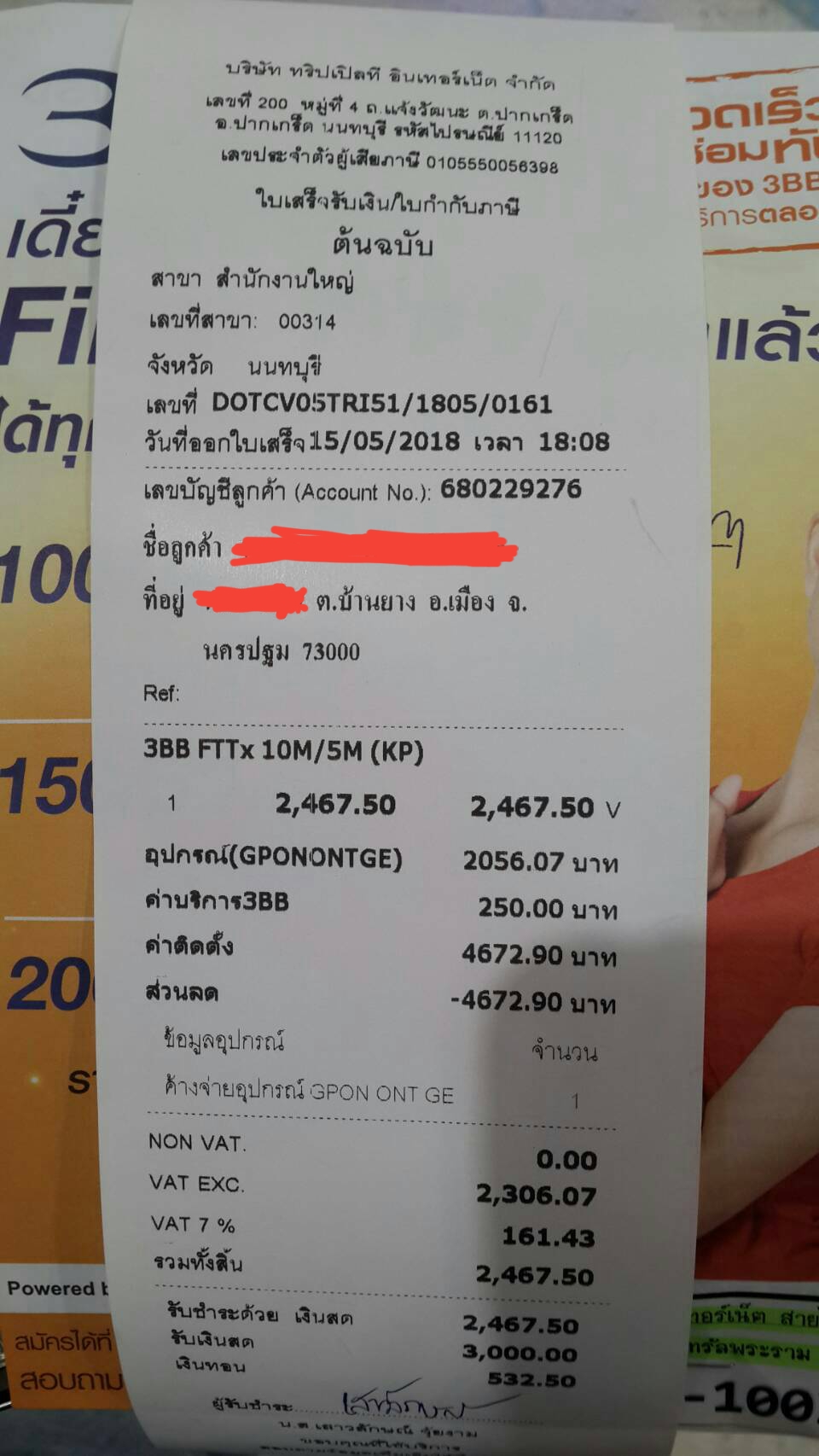 เมื่อวันที่ 13 พ.ค. คุณพ่อได้โทรติดต่อสอบถามกับ 3BB เรื่องการติดตั้ง Internet 10/5 เดือนละ 250 บาท ที่ ตำบลบ้านยาง อำเภอเมือง จ.นครปฐม