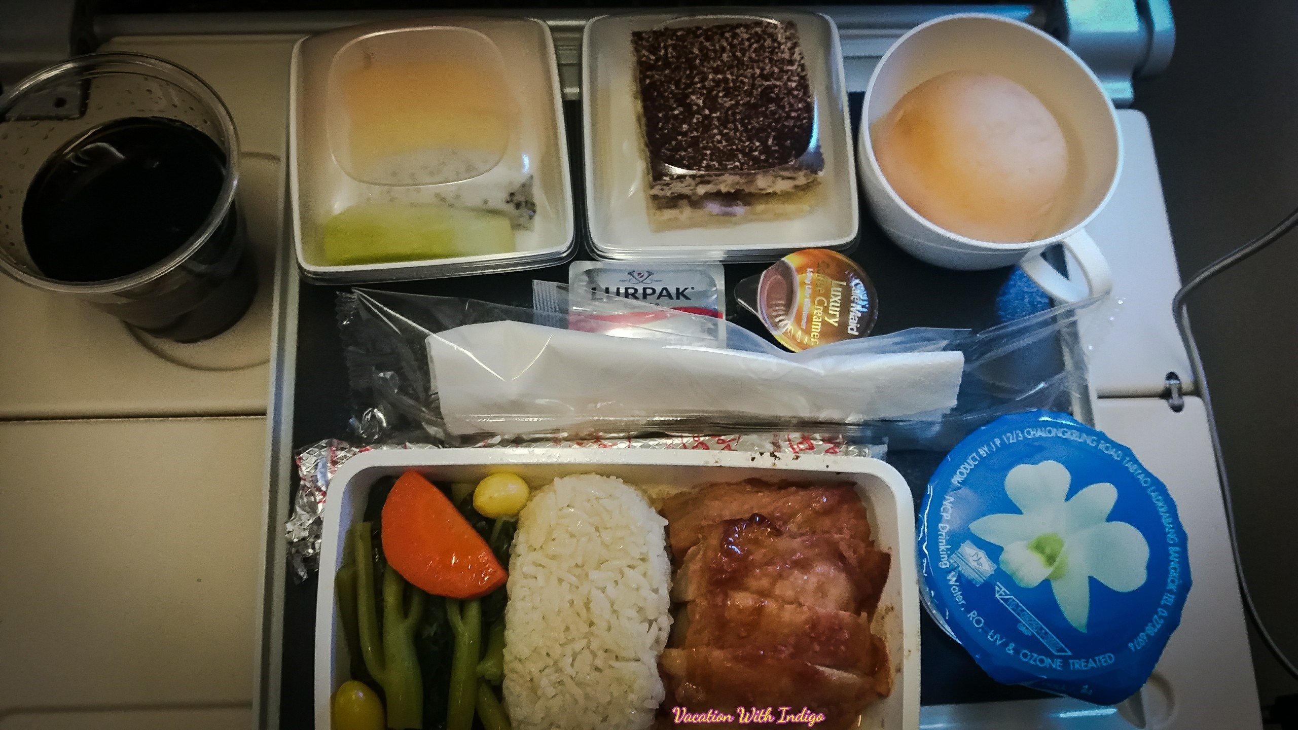 และแล้วเครื่องก็ออกเดินทางจากสนามบินสุวรรณภูมิไปสนามบินชางฮี ประเทศสิงคโปร์ จะใช้เวลาเดินทาง 2 ชั่วโมงโดยประมาณ หลังจากนั้นขึ้นเครื่องมา แอร์ก็จะนำผ้าร้อนมาให้เช็ดมือ ตอนแรกก็ร้อนๆพอเช็ดไปสักพัก รู้สึกดีจัง ชอบ 555+ และหลังจากนั้น แอร์ก็นำอาหารมาเสิร์ฟ มีหลายอย่างให้เลือกเลย ที่เราเลือกเป็นไก่อบซอสมา ในเซทก็จะมีข้าวอบไก่ มีผลไม้ ขนมปัง เนย กาแฟ น้ำเปล่า ขนมเค้ก โดยรวมรสชาติกำลังดีค่ะ หมดเหลือแต่ผัก 555+