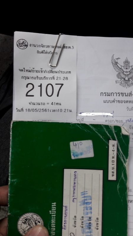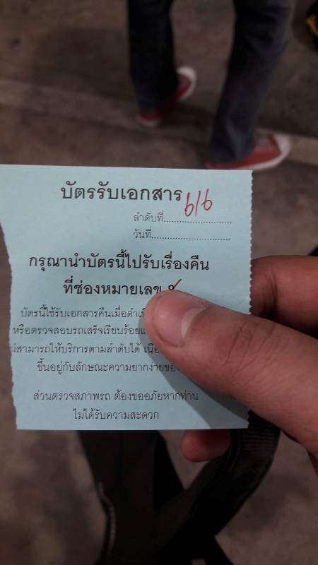 4. หลังจากตรวจสภาพผ่านแล้ว รับเอกสารตามข้อ 1.2 คืน แล้วไปติดต่อที่ประชาสัมพันธ์ อาคาร 2 ชั้น 1 เหมือนเดิม *** คนเยอะเหมือนเดิม ***
