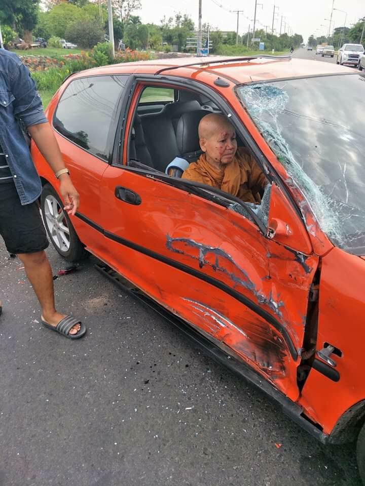 ภิกษุณี ...ขับเก๋งออกจากปั้ม ! จยย.ขี่มาทางตรงชนเข้าเต็มแรง