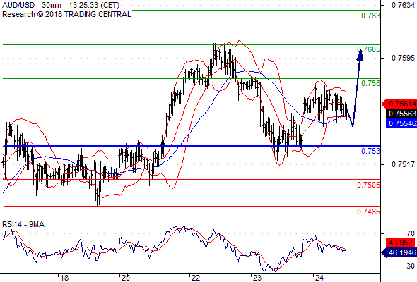 จุดที่ต้องการ: สถานะซื้อสูงกว่า 0.7530 เป้าหมายต่อไปที่ 0.7580 และ 0.7605