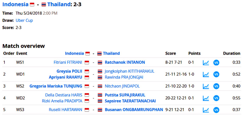 • Match Uber Cup Indonesia - Thailand : https://www.tournamentsoftware.com/sport/teammatch.aspx?id=0057097B-20D5-4CF4-8E22-7138EE7565DC&match=149