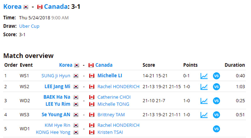 • Match Uber Cup Korea - Canada : https://www.tournamentsoftware.com/sport/teammatch.aspx?id=0057097B-20D5-4CF4-8E22-7138EE7565DC&match=148
