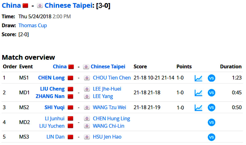 • Match Thomas Cup China - Chinese Taipei : https://www.tournamentsoftware.com/sport/teammatch.aspx?id=0057097B-20D5-4CF4-8E22-7138EE7565DC&match=68