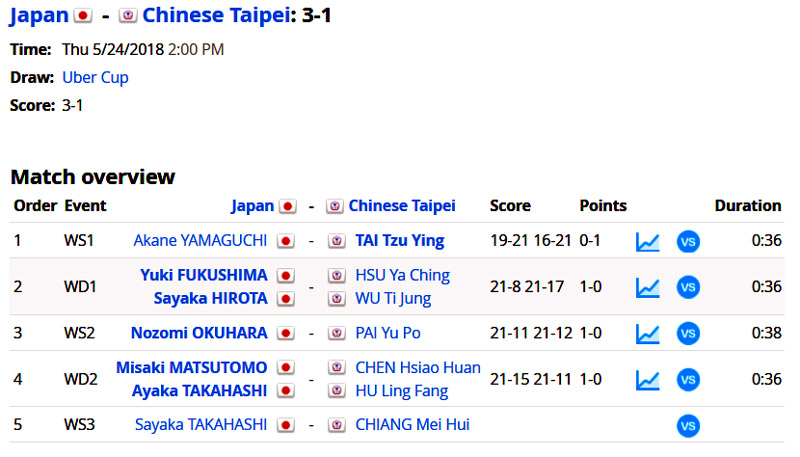 • Match Uber Cup Japan - Chinese Taipei : https://www.tournamentsoftware.com/sport/teammatch.aspx?id=0057097B-20D5-4CF4-8E22-7138EE7565DC&match=147