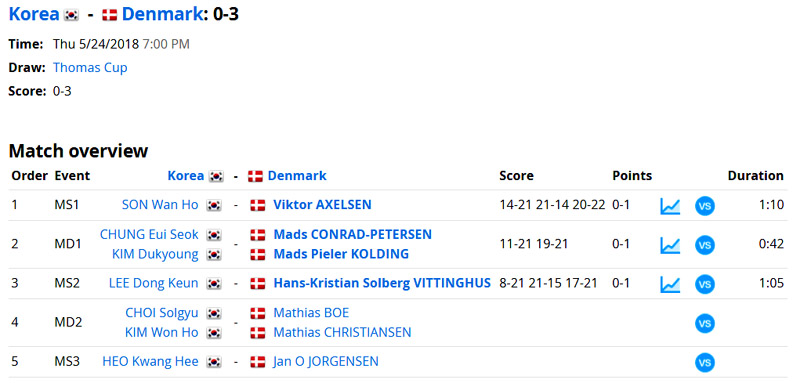 • Match Thomas Cup Korea - Denmark : https://www.tournamentsoftware.com/sport/teammatch.aspx?id=0057097B-20D5-4CF4-8E22-7138EE7565DC&match=71