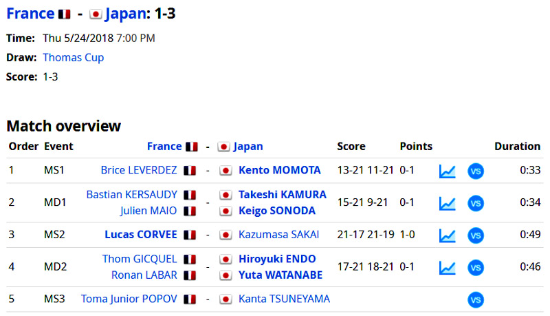 • Match Thomas Cup France - Japan : https://www.tournamentsoftware.com/sport/teammatch.aspx?id=0057097B-20D5-4CF4-8E22-7138EE7565DC&match=70