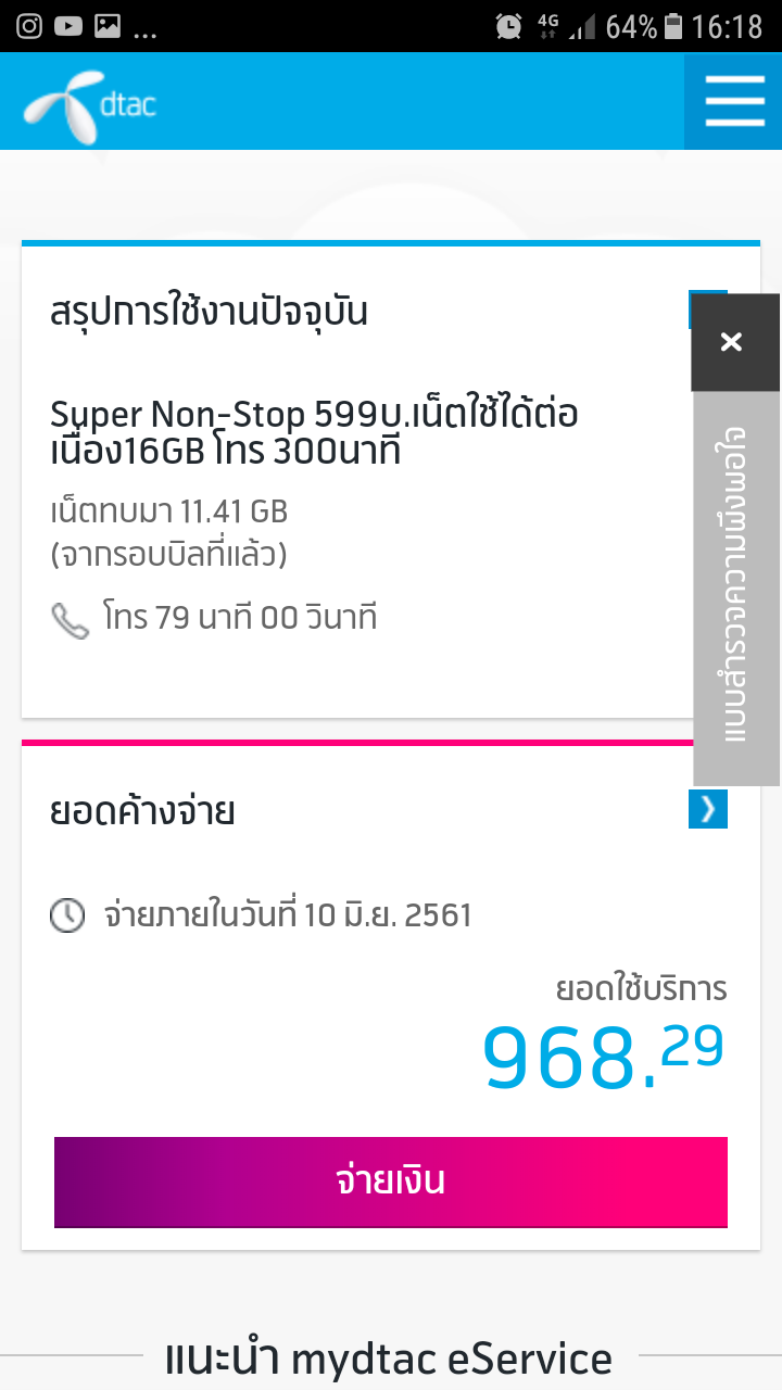 อยากเช็คการใช้บริการครับพอดีใช้รายเดือน 599 แต่บิลมา 900+ Dtac