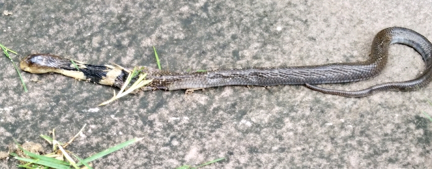 ปกติ ปิดประตูหน้า บานด้านในไว้ตลอด แต่วันนี้ เปิดเพราะเพิ่งกลับมาถึงบ้าน แป๊บเดียว เพื่อนบ้านข้ามถนน ผ่านรั้วเข้ามาเกาะประตูบ้าน บอกว่า .... งู งู งู เลย ห้ะ? อะไรนะ ... เพื่อนบ้านบอก อย่าเพิ่งออกมา