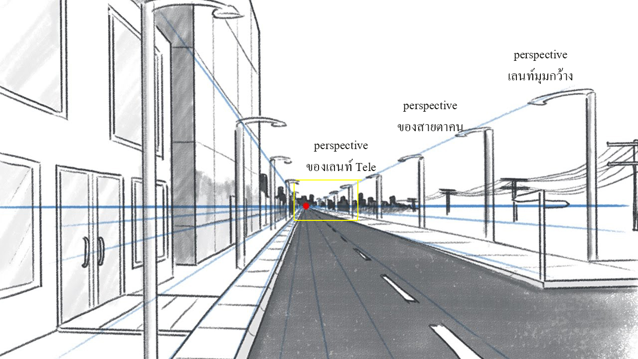 ทีนี้ในสภาพกล้องบางตัวใช้เลนท์มุมกว้าง เพื่อจะถ่ายให้เห็นภาพกว้างๆ เปอสเปคทีพที่ออกมาก็จะเป็นการผลักวัตถุให้ไกลหรือยืดออกไป มากกว่าที่ตาเราเห็น และในทางตรงข้ามกันเมื่อกล้องเจาะถ่ายใกล้ๆ ก็จะใช้เลนท์ทางยาวโฟกัสยาว มันก็จะทำให้เปอสเปคทีพต่างจากตาเราออกเห็นอีก หรือวัตถุต่างๆจะดูเหมือนถูกดังให้มาชิดกันครับ พิสูจน์ด้วยตัวเองง่ายๆด้วยการไปยืนริมถนนแล้วมองเสาไฟฟ้า จะเห็นว่ายิ่งไกลออกไปเสาไฟฟ้าแต่ล่ะต้นจะดูเหมือนอยู่ชิดกัน