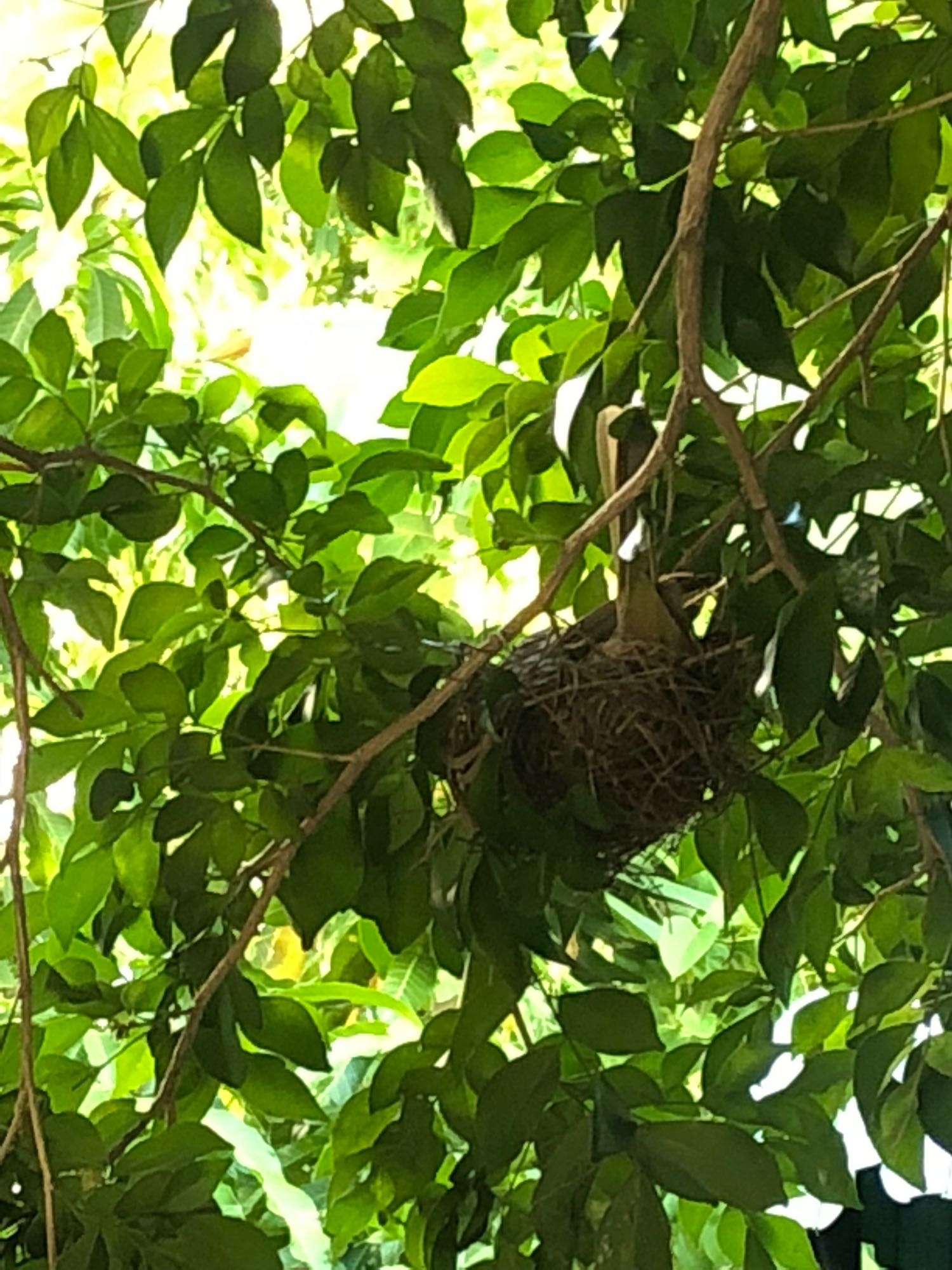 พ่อแม่นกสร้างรังเมื่อสามสี่สัปดาห์ได้แล้วมั๊ง รังอยู่ใกล้ประตูข้างบ้านนิดเดียว เจ้าของบ้านเปิดประตูเข้าออกไปบ่อปลานี่เดินเฉียดรังไปแค่มือเอื้อมถึงเท่านั้นแหละ ก็ไม่หนีนะ ช่วงที่ฟักไข่อยู่นี่ เวลาคนเดิ