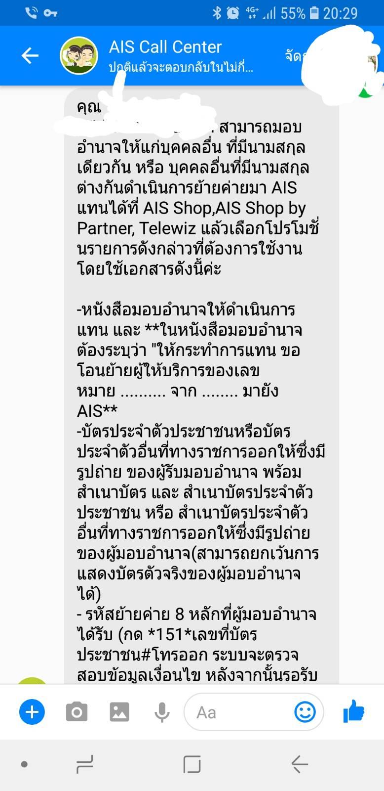 แต่พอไปที่ช็อป Telewiz พนักงานบอกไม่ได้ต้องใช้บัตรประชาชาตัวจริง แต่พอให้ดูแชทที่ CC Ais ตอบ ก็บอกว่าให้ลองย้ายดู แต่ให้ไปติดต่อที่ทรูก่อนเพื่อชำระค่าบริการและย้ายค่าย