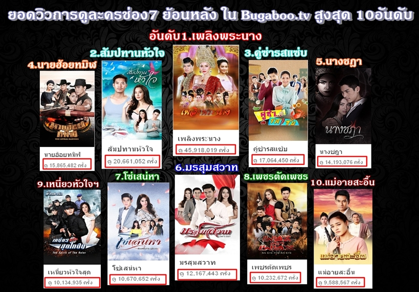 ยอดวิวการดูละครช่อง7 ย้อนหลังใน Bugaboo.tv สูงสุด 10 อันดับ