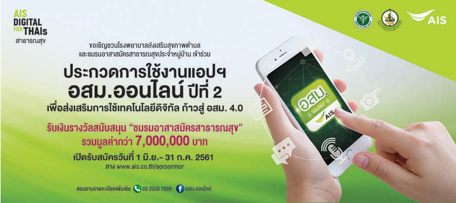 เอไอเอส สานต่อความร่วมมือกับกระทรวงสาธารณสุข และกระทรวงดิจิทัลเพื่อเศรษฐกิจและสังคม จัดโครงการ “ประกวดการใช้งานแอปพลิเคชัน อสม.ออนไลน์ ปีที่ 2” เพื่อส่งเสริมศักยภาพของ อสม.ในการใช้เทคโนโลยีดิจิทัลเข้าไปช่วยดูแลสุขภาพคนในชุมชน ยกระดับคุณภาพชีวิตของคนไทย โดยเชิญชวนโรงพยาบาลส่งเสริมสุขภาพตำบล และอาสาสมัครสาธารณสุขประจำหมู่บ้านทั่วประเทศเข้าร่วมประกวดฯ เพื่อก้าวสู่การเป็นอสม. 4.0 พร้อมรับเงินสนับสนุน “ชมรมอาสาสมัครสาธารณสุข” มูลค่ารวมกว่า 7 ล้านบาท เปิดรับสมัครตั้งแต่วันที่ 1 มิถุนายน – 31 กรกฎาคม 2561
