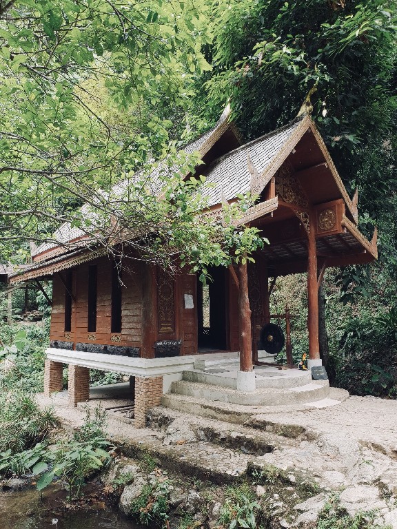 ในส่วนของโบสถ์นั้น จะอยู่กลางลำธาร ท่ามกลางธรรมชาติสุดๆ ถ้ามานั้งวิปัสนาที่นี่คงเย็นทั้งกาย ทั้งใจเลยค่ะ เราโชคดีที่ไปช่วงที่ไม่ค่อยมีคน คนไม่เยอะ ไม่แย่งกันกิน แย่งกันเที่ยว ก็เลยถ่ายรูป นั่งชิว เยอะหน่อย ฮ่าๆ