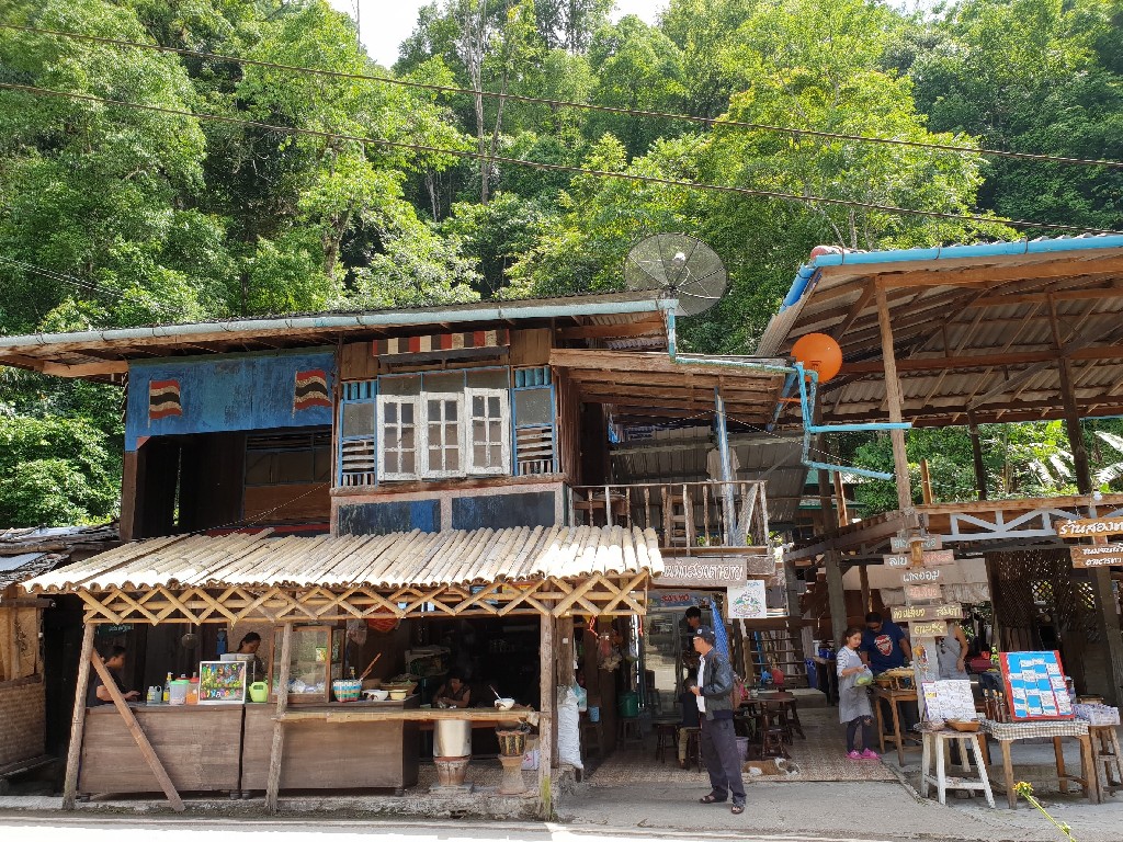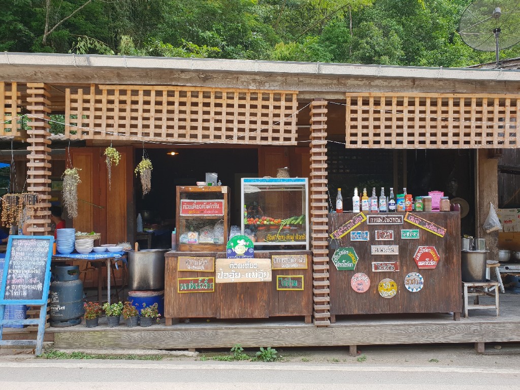 พอไหว้พระเสร็จก็เดินเรื่อยๆ(จอดรถที่วัด) ชมหมู่บ้าน ชมวิถีชาวบ้านที่นั่น เขาก็ปิ้งเผือก ปิ้งมันขาย จริงๆร้านข้าว ร้านกาแฟ ร้านก๋วยเตี๋ยว ก็มีเยอะอยู่นะคะ เลือกนั่งได้เลย เพราะแต่ละที่บรรยากาศคล้ายๆกัน คือมีภูเขาโอบล้อม ด้านล่างเป็นลำธาร น้ำตก รอบๆเป็นป่าาา ถ้าขึ้นสูงหน่อยก็จะเจอทิวเขามองไปสุดลูกหูลูกตาเลยทีเดียว