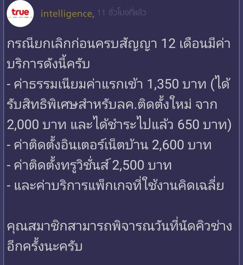 เจ้าหน้าที่ของทรูในนี้ก็พยายามช่วยเหลือ สรุปผมต้องรอคิวช่าง 3 วัน แล้วถ้าผมยกเลิกจะมีค่าใช้จ่ายสูงมาก