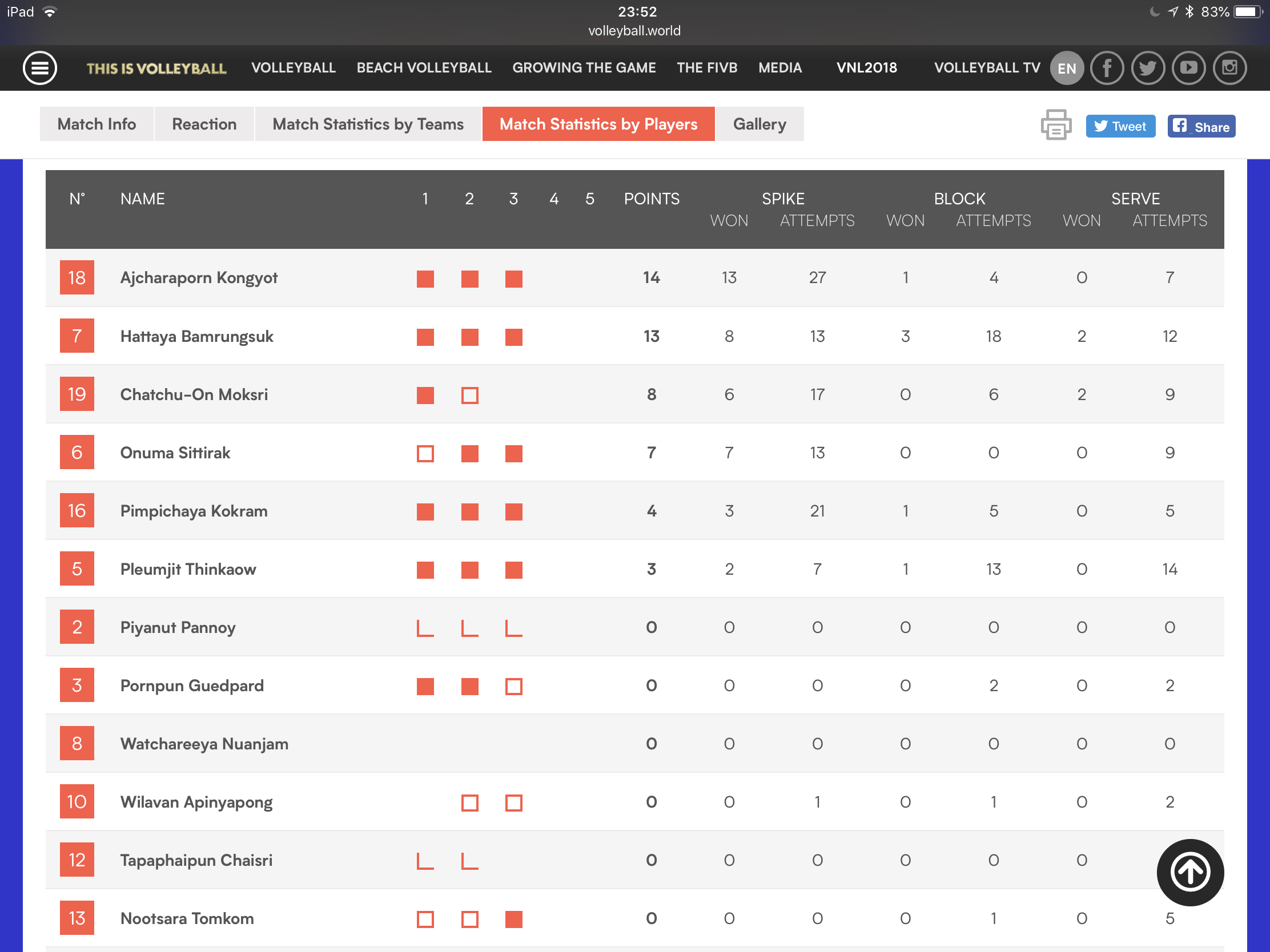 สถิติไทย(U23) พบ ฟิลิปปินส์ ในศึกวอลเลย์บอลหญิง VTV Cup ณ เมือง Bac Lieu ประเทศเวียตนาม วันที่สองของการแข่งขัน ชัชชุอร โมกศรี 16 คะแนน // อัจฉราพร คงยศ 14 คะแนน ข้อมูลจาก...โค้ชด่วน ..............