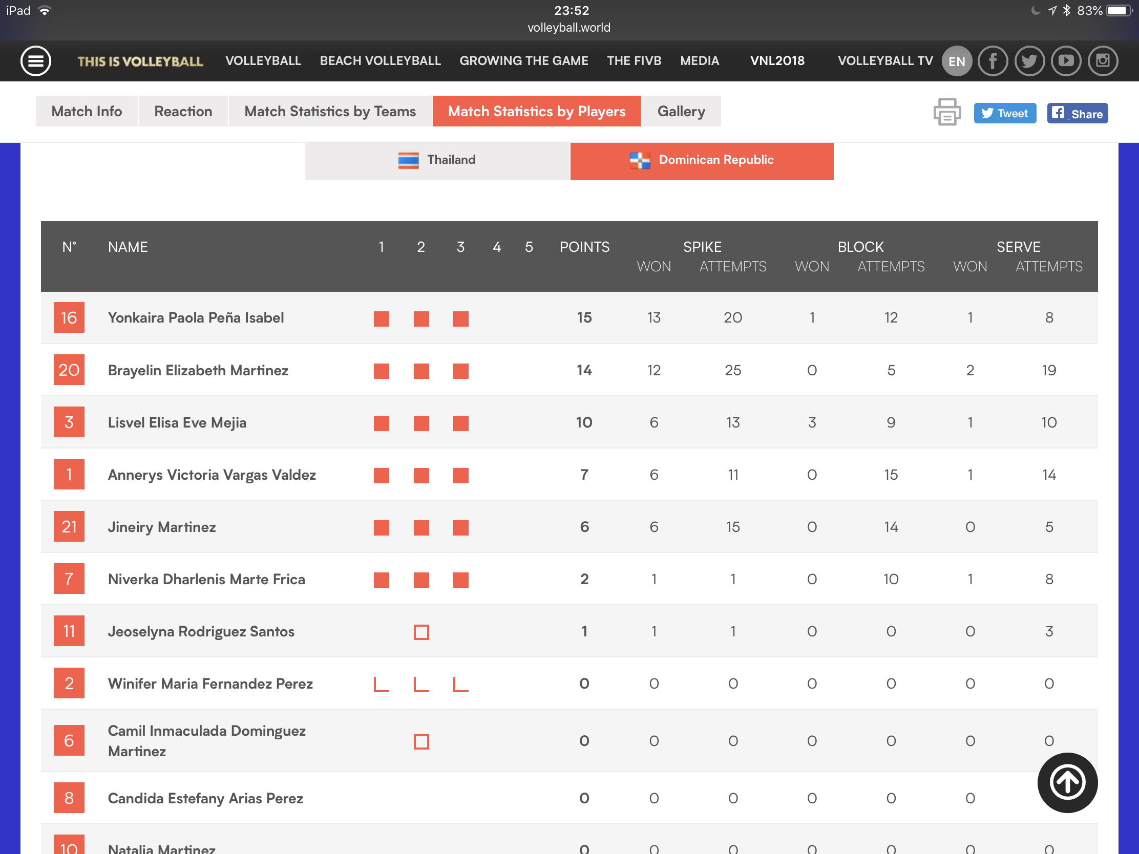 *** สถิติผู้เล่น VNL 2018 ไทย 0-3 โดมินิกัน *** เพียวท๊อปสกอร์