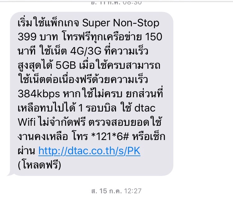 เราใช้ Dtac package399 ซึ่งทันจะหมดอายุวันที่ 9พค56 เวลา17.50 ซึ่งพอหมดแพกเกจมันก็ต่ออายุไม่ได้เพราะเงินไม่พอ เรามาเติมทีหลังตอนหกโมงเย็น แล้วสมัครแพกเกจ399ใหม่ พอระบบส่งsmsยืนยันมาว่าใช้ได้ เราก็เช็ก